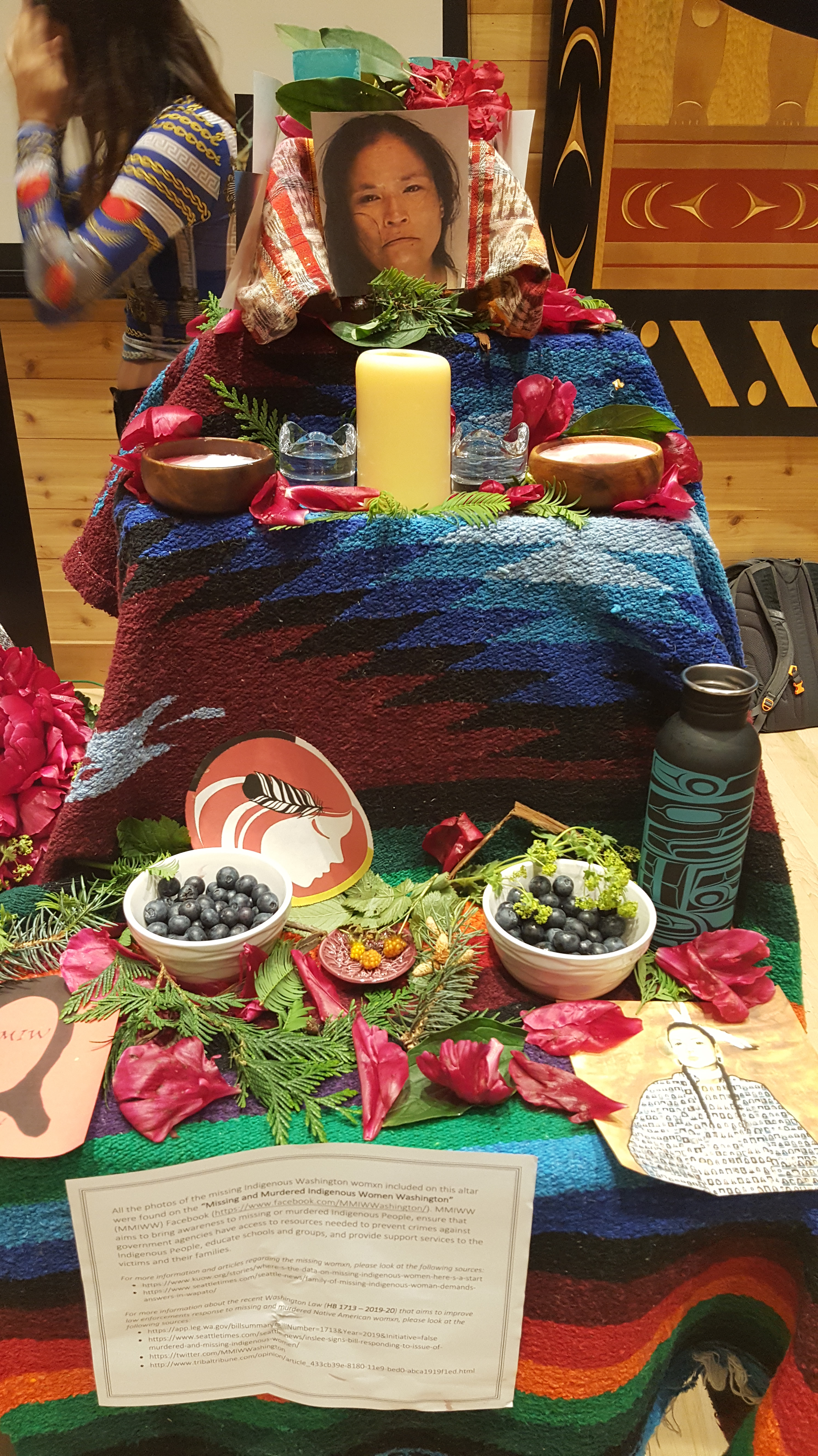Our group wanted to remember the missing indigenous women in Washington State and included objects to represent the women’s indigenous roots. The leaves and flowers signify the importance nature plays on indigenous women and placing images of a few missing women allowed the viewer to connect the movement to a face. The placement of the altar’s beside each other was not only visually appealing but also, demonstrates how the concept of an altar is interpreted differently from the various groups.