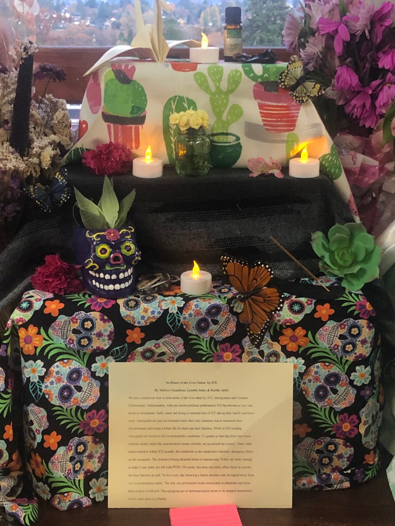 This is our altar that group 4 students created. It is dedicated to the lives taken by Immigration and Customs Enforcement (ICE). This is important in today’s world because our current political administration has created an unconductive environment for immigrants. Many people continue to live in fear, this is wrong. People are being taken away from their loved ones, creating a lot of tension for them. Immigrants have been portrayed as criminals and as a threat to the peace and security of Americans while this is not a reality. The truth behind this is immigrants are just people who are trying to make a better life for themselves and their families. They should not be seen as threats. It is important that we love and care for each other and support one another.
