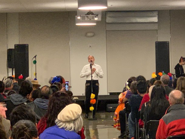 At El Centro’s stage for DDLM, one of the MC’s, El Vez, is paying homage to his friend, Kim, a musician, performer, and somebody very dear to him who cannot be fully encapsulated in words. (Photo taken by John Petrovich, group 8).