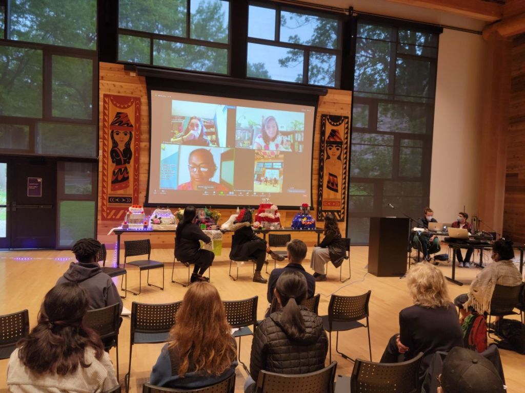 We chose the first photo as a way to set the scene of the event and to capture the Ofrendas that our entire class contributed to the event. We believed that it showed an important connection of the classroom to real discussions. Our next three photos show the actual conversation flowing between speaker and presenters. We chose these photos because there was such a variety of conversations we created in this space. We had virtual and in person conversation, which allowed people from all locations to have a voice in the discussion. The discussions were also held in both English and Spanish, which made the conversation more inclusive. The fifth photo, which is a picture of Joselin by an information board, was chosen due to the intent to inform younger people about community history. Lastly, we included the photo of Black Mama’s preformance because in this course we have learned that activism does not just come