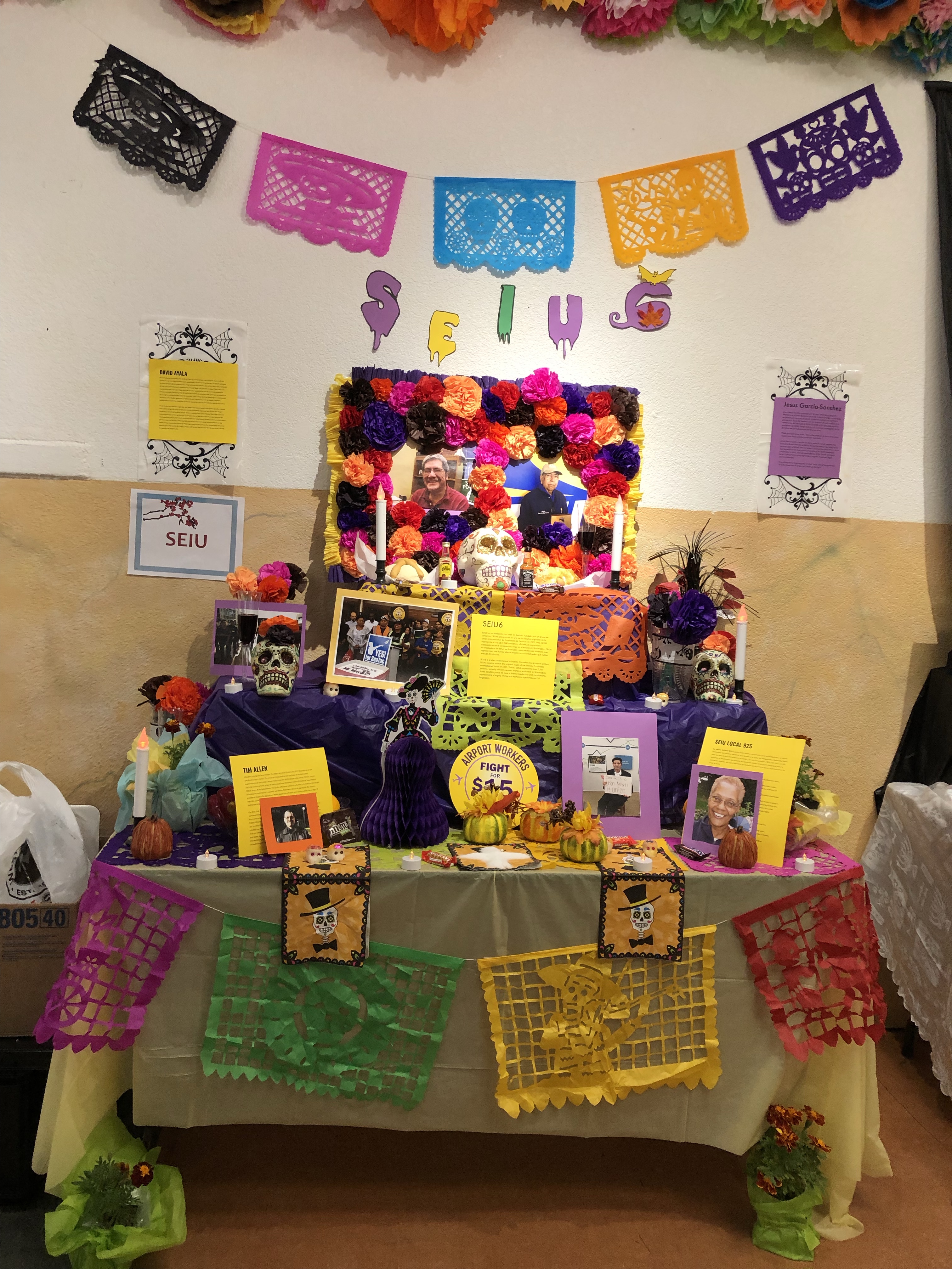 -This photo was at the Dia De Los Muertos Celebration, in El Centro De La Raza’s Seattle, WA. Taken by Group 9 , UW students in GWSS 451 on November 1 2019. The capture represents SIEU 6 service that protect workers rights.