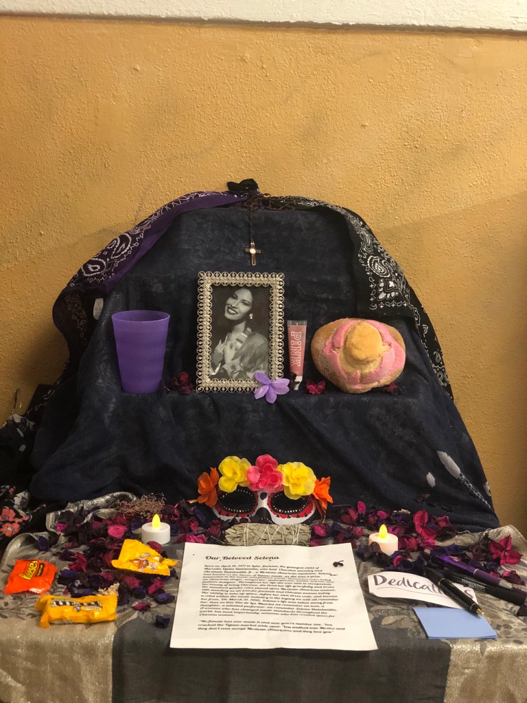 In the capture there are many people who have different cultural backgrounds and personal identities. They are all sharing one table, and they were all enjoying eating one type of food that represents Mexican food tradition. I personally never tried Mexican food before, when I tried it in the altar/ ofrenda event, I found out it is very similar to the Middle Eastern food which is wonderful. The people were having fun talking to one another and celebrating the Altar/ Ofrenda honoring the memory of the people who have passed away.